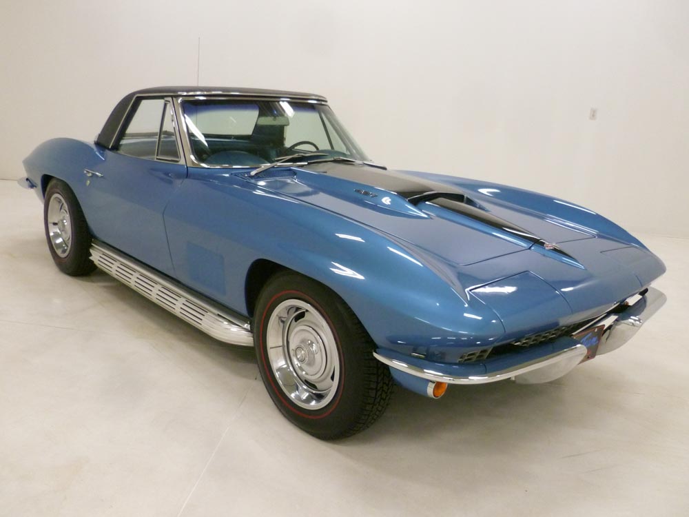1025U..1967 Corvette Convertible with Two Tops, 427-400 hp, 4 speed, numbers matching original motor and transmission, also has factory original body/trim tag with CCAS/Grenning Trim Tag Affirmation, 2 or 3 owner car with 62,943 actual miles. Silver Pearl paint with Teal Blue stinger, Teal Blue interior and Teal Blue soft top. Body-off restored in show condition. Also has an affirmation by CCAS/Grenning as to the legitimacy and originality of the engine block, stamp pad, and the engine stamp. These type restorations normally cost between $125,000.00 to $150,000.00. This restored Corvette has yet to be shown, creating an exciting opportunity for the next owner to exhibit the car and compete for trophies, awards, and recognition! Optioned with power windows, leather, headrest seats, auxiliary hardtop, M-21, 3.36 posi, SS brakes, AM/FM radio, tri-power, tinted glass, B.O. aluminum wheels and vintage 7.75x15" red stripe tires. Most all factory correct type components including the spare, jack, clear floor mats, seat belts, washer system, shifter, shielding, braided wires, air cleaner, alternator, hoses, hose clamps, starter, gas door assembly, glove box door, warranty book, owners manual, sales brochure, and T-3 headlights. Documented with warranty book/P.O.P., CCAS/Grenning Engine Stamp Affirmation, CCAS/Grenning Trim Tag Affirmation, owners manual packet, previous owner's title, numbers sheet and 3-ring binder. Only 2,101 427-400 hp were produced in 1967. From the past owner of 19 years. Production date of September 21, 1966 and delivered new by Huebsch Chevrolet in Prairie Du Chien, WI (dealer code 292 in zone 61) per the official NCRS/GM Shipping Data Records (SDR). Looks, runs, and drives excellent. CC:1 Consigned to Mecum Kissimmee Collector Car Auction January 15th - 17th, 2026