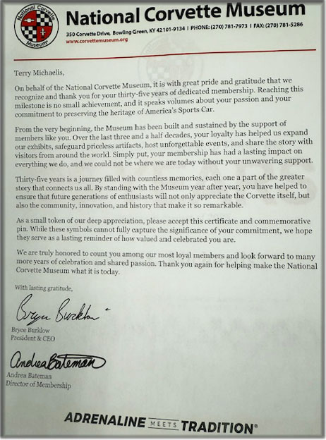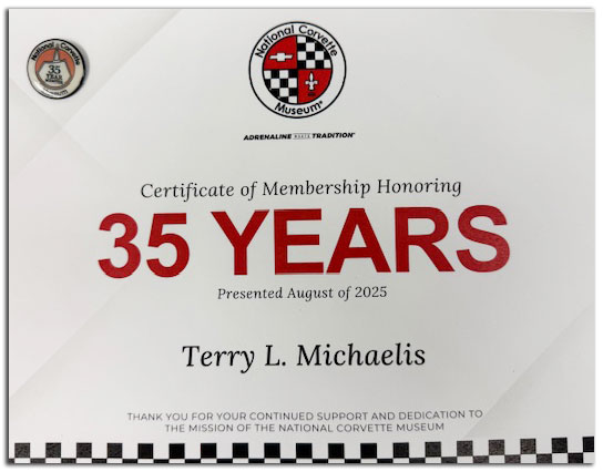 Terry Michaelis, On behalf of the National Corvette Museum, it is great pride and gratitude that we recognize and thank you for your thirty-five years of dedicated membership. Reaching this milestone is no small achievement, and it speaks volumes about your passion and your commitment to preserving the heritage of America’s Sports Car. From the very beginning, the Museum has been built and sustained by the support of members like you. Over the past three and a half decades, your loyalty has helped us expand our exhibits, safeguard priceless artifacts, host unforgettable events, and share story with visitors from around the world. Simply put your membership has had a lasting impact on everything we do, and we could not be where we are today without your unwavering support… With Lasting Gratitude, B. Burklow (CEO) and A. Bateman (Dir. Membership)