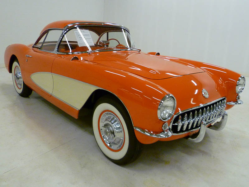 1004W..1957 Corvette Convertible Hardtop, 283-270 hp, (2x4s), 3-speed, numbers matching. Venetian Red paint with Beige coves and Red interior. Body-off restored by NCRS judge (Ed Hoffman) resulting in a plethora of awards that include two Bloomington Gold awards, four NCRS Top Flight awards, the NCRS (PV) Performance Verification award and the coveted NCRS Duntov Mark of Excellence award. This restoration included blue printing the motor with a Duntov cam and #997 heads. The expenses involved in obtaining these awards would surely exceed $20,000.00. These type restorations normally cost between $125,000.00 to $150,000.00. Radio, heater, and soft top delete car optioned with auxiliary hardtop, posi, dual fours, off road exhaust, hubcaps, and vintage 6.70x15" wide white tires. Also has custom fit car cover. Most all factory correct type components including the spare, jack, jack tools, trunk mat, trunk liner, rebound straps, spiral shocks, shifter, air cleaners, generator, starter, distributor, hoses, hose clamps, hood alignment blocks, nine fin valve covers, hood pop-ups, fuel filter, carbs, guide Y-50 mirror, owners manual, sales brochure, and T-3 headlights. Documented with the original owners manual, California black license plates, restoration photos, NCRS Confirmation of Awards, show awards, certificates, and judging sheets all neatly organized in no less than 4 binders. Please note that the NCRS Duntov plaque was kept by a previous owner. Sold new at Lellis-Brooks Chevrolet in San Francisco, CA and called the Golden State its home until 2008. Production date of May 2nd, 1957. Looks, runs, and drives excellent. CC:1 $149,000.00