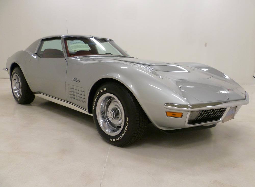 1002W..1970 Corvette Coupe with removable T-Tops, LT1, 350-370 hp, 4 speed, numbers matching original motor, transmission and rear end. Also has the factory original body/trim tag with CCAS/Grenning Trim Tag Affirmation. Ultra rare and desirable color combination of Cortez Silver lacquer paint with a Monza Red interior. Body-on restored including brakes, carb, distributor, smog system and heater core in excellent condition. One of 1,287 LT1's produced in 1970 with CCAS/Grenning Engine Stamp Affirmation. Optioned with M21, 3.70 posi, AM/FM stereo radio, rallys wheels and raised white lettered tires. Most all factory correct type components including the spare, jack, jack tools, T-Top bags, seat belts, washer system, smog system, shifter, shielding, air cleaner, spark plug shields, hoses, hose clamps, valve covers, starter, gas door assembly, owners manual, and sales brochure. Documented with the tank sticker, Engine and Trim Tag Affirmations, owners manual packet, owner history, vintage photos, maintenance receipts and two 3-ring binders. Production date of June 25th, 1970 and delivered new by The Karl Chevrolet Company in New Canaan CT (dealer code 289 in zone 2) per the official NCRS/GM Shipping Data Records (SDR). Looks, runs, and drives excellent. CC:1/+2 $119,000.00