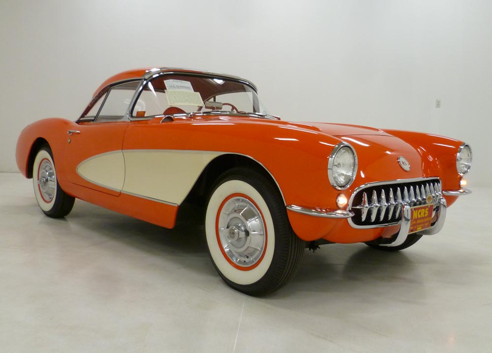 1004W..1957 Corvette Duntov Convertible Hardtop, 283-270 hp, (2x4s), 3-speed, numbers matching. Venetian Red paint with Beige coves and Red interior. Body-off restored by NCRS judge (Ed Hoffman) resulting in a plethora of awards that include two Bloomington Gold awards, four NCRS Top Flight awards, the NCRS (PV) Performance Verification award, the coveted NCRS Duntov Mark of Excellence award, and the AACA National First Prize Award. The most recent awards include: Bloomington Gold (2025), Class Award at the Amelia Concours d'Elegance (2025) and the Bill Rudd Memorial Corvette award at the Cincinnati Concours d'Elegance (2025). This restoration included blue printing the motor with a Duntov cam and #997 heads. The expenses involved in obtaining these awards would surely exceed $20,000.00. These type restorations normally cost between $125,000.00 to $150,000.00. Radio, heater, and soft top delete car optioned with auxiliary hardtop, posi, dual fours, off road exhaust, hubcaps, and vintage 6.70x15" wide white tires. Also has custom fit car cover. Most all factory correct type components including the spare, jack, jack tools, trunk mat, trunk liner, rebound straps, spiral shocks, shifter, air cleaners, generator, starter, distributor, hoses, hose clamps, hood alignment blocks, nine fin valve covers, hood pop-ups, fuel filter, carbs, guide Y-50 mirror, owners manual, sales brochure, and T-3 headlights. Documented with the original owners manual, California black license plates, restoration photos, NCRS Confirmation of Awards, show awards, certificates, and judging sheets all neatly organized in no less than 4 binders. Please note that the NCRS Duntov plaque was kept by a previous owner. Sold new at Lellis-Brooks Chevrolet in San Francisco, CA and called the Golden State its home until 2008. Production date of May 2nd, 1957. Looks, runs, and drives excellent. CC:1 $149,000.00